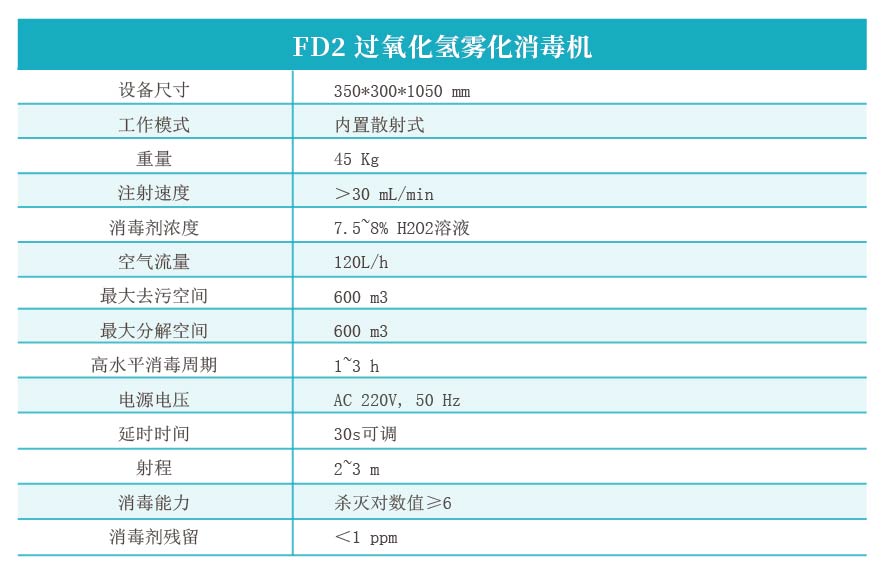 FD2过氧化氢雾化消毒机内置微米级干雾系统将食品级7.5%过氧化氢溶液雾化后喷洒于需要消毒的环境内,干雾具有较强的扩散性能更好的作用于空间及物表。过氧化氢可以高效的进攻细胞成分(包括脂类、蛋白质和DNA)从而达到消毒、高水平消毒的目的。